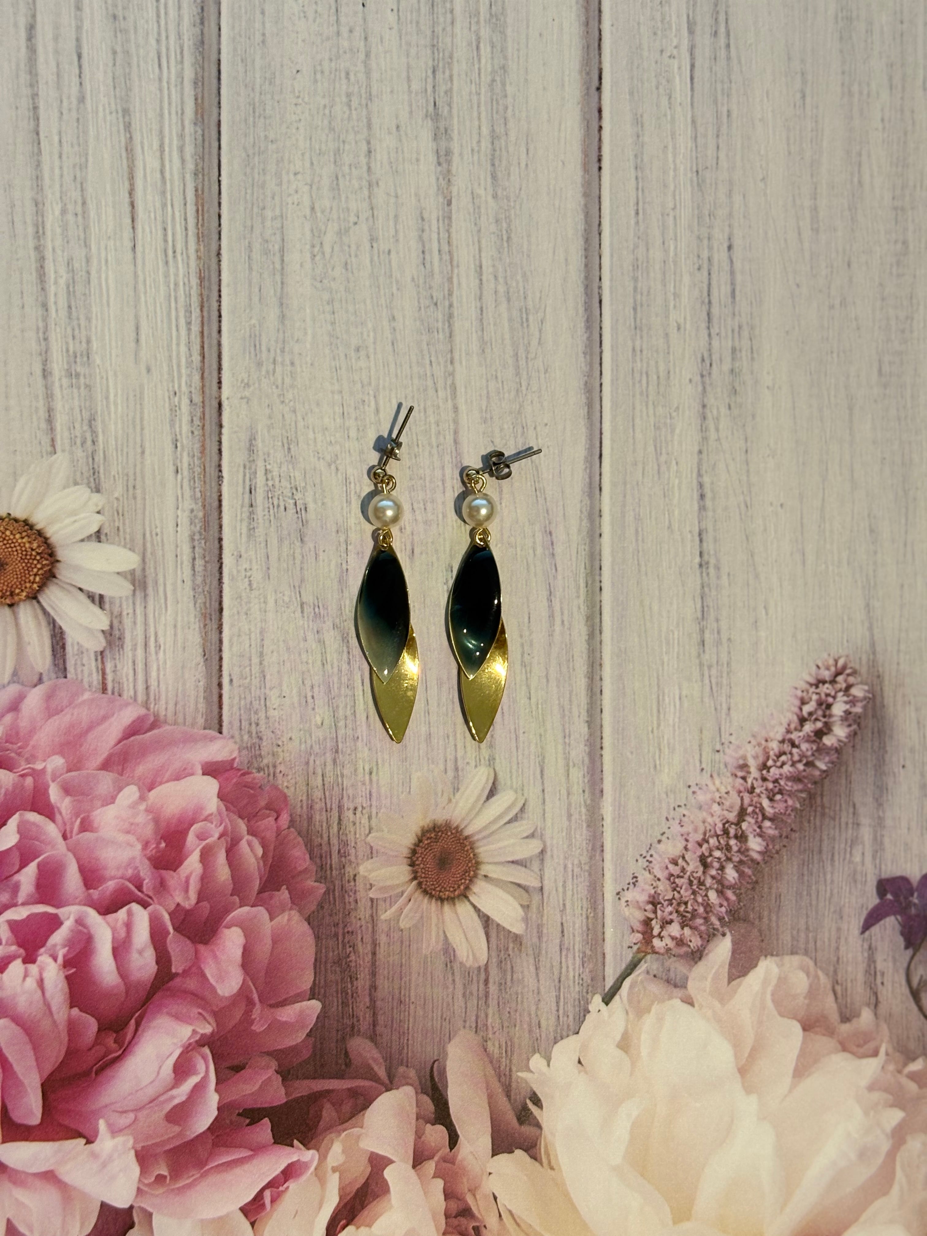 ふわりと揺れる小さなパールと光に当たると綺麗なゴールドと青系パーツが美しく調和したデザインは、軽やかで女性らしい印象を与え、様々なシーンに対応します。