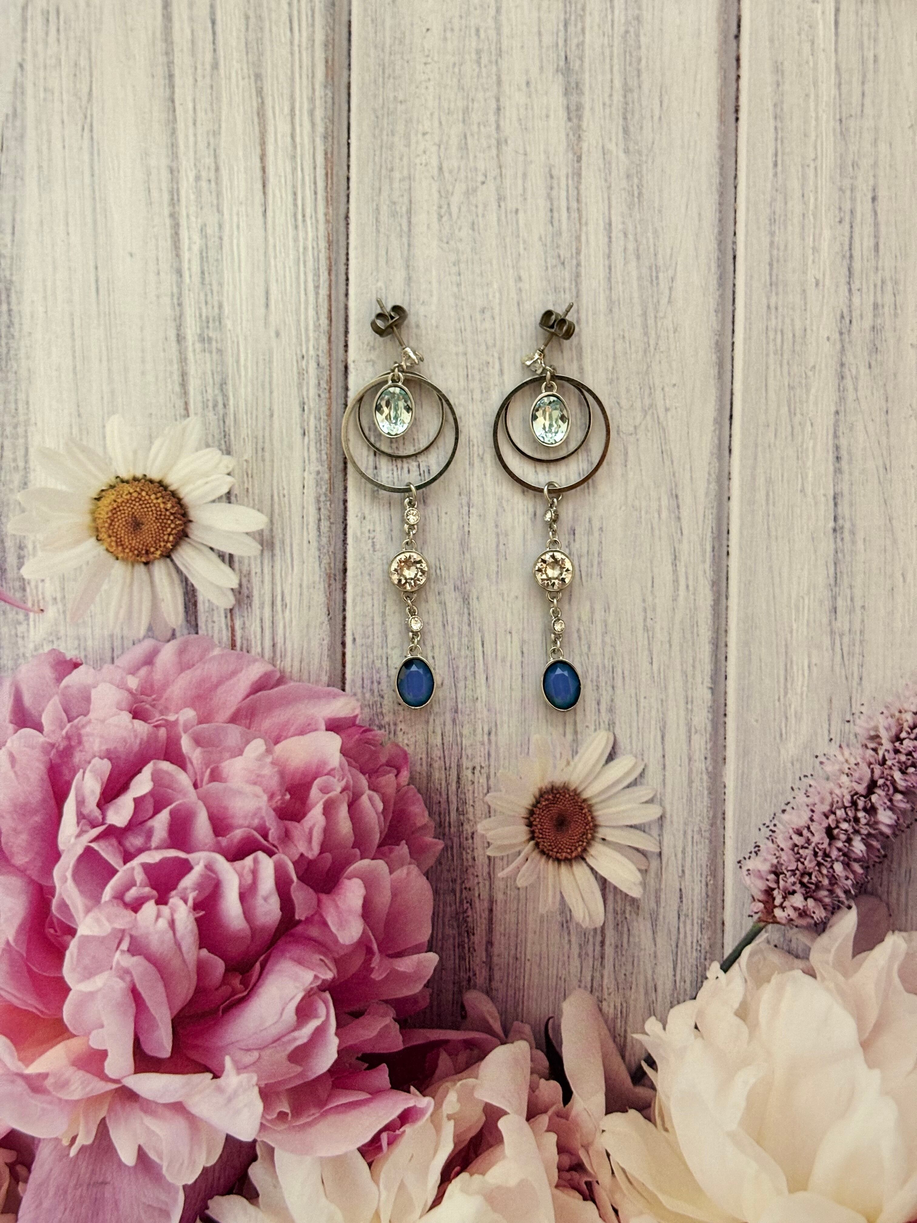 シルバーと青の組み合わせのロングピアス。繊細なデザインとシンプルながらも存在感のある色使いがおしゃれなアクセサリーです。耳元で揺れる優雅なシルエットが、女性らしさを引き立ててくれます。